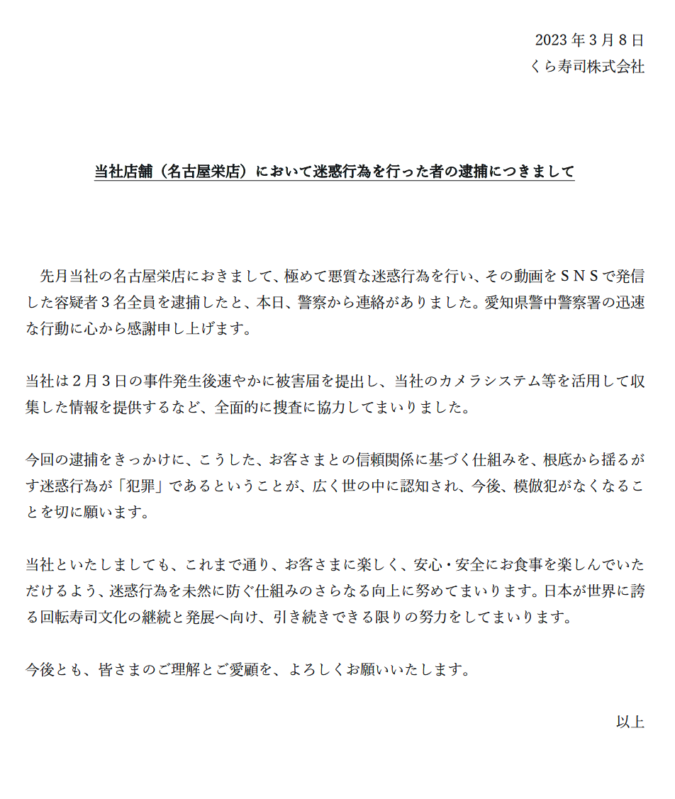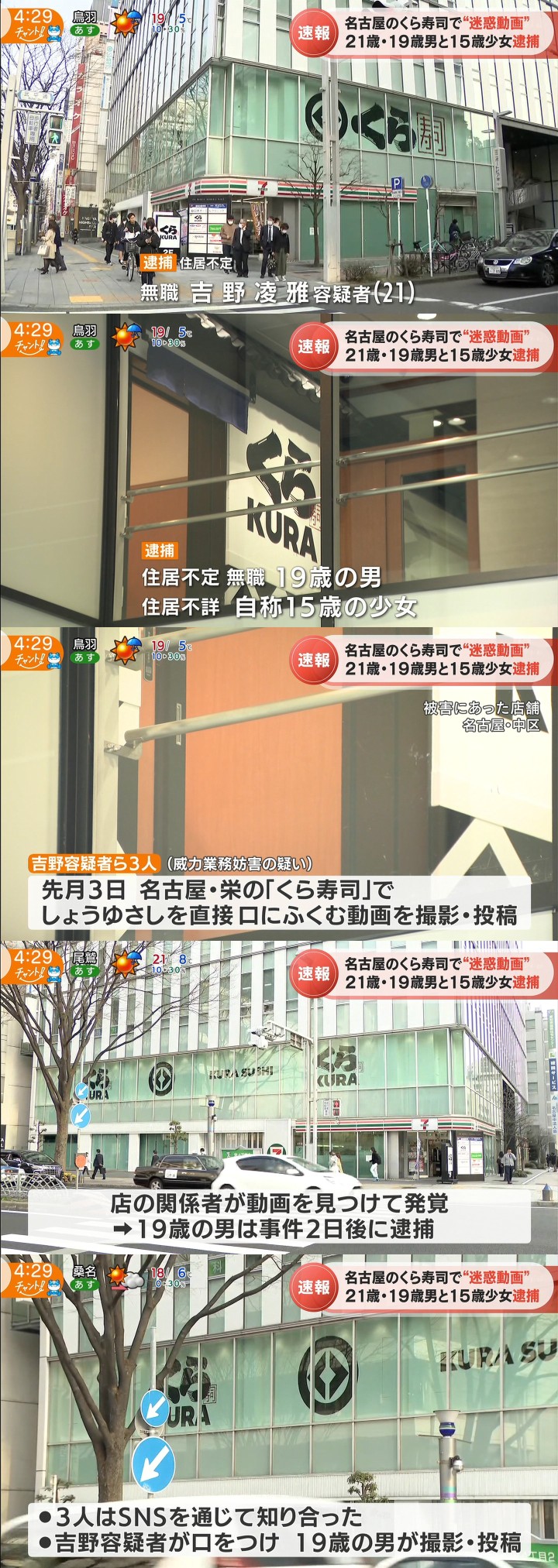 発表によると、3人は2月3日夜、名古屋市中区の「くら寿司(ずし)名古屋栄店」で、テーブルに設置されたしょうゆ差しの注ぎ口を口に含むなどした様子を撮影。その動画をSNS上に投稿し、店側に臨時清掃を余儀なくさせるなどして営業を妨害した疑い。