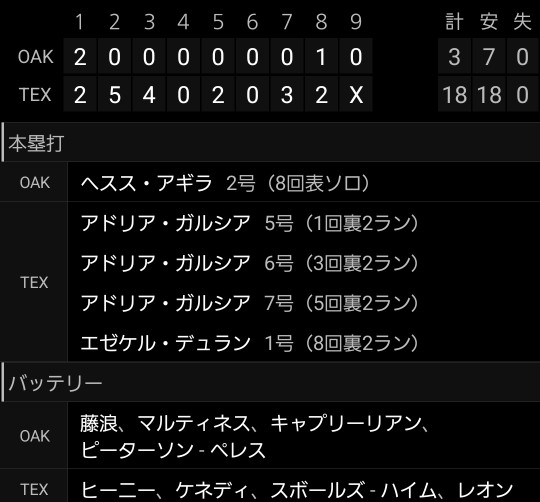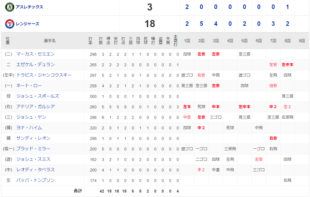 ■レンジャーズ ー アスレチックス(日本時間23日・アーリントン)