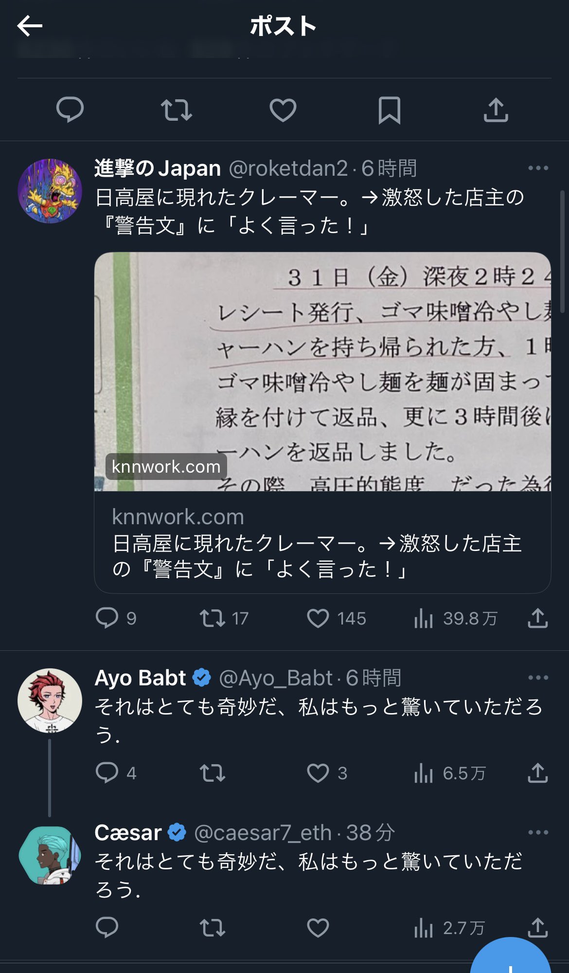 伸びてるツイートのリプライ欄が青バッジ付きのインプレッション乞食で埋まる模様