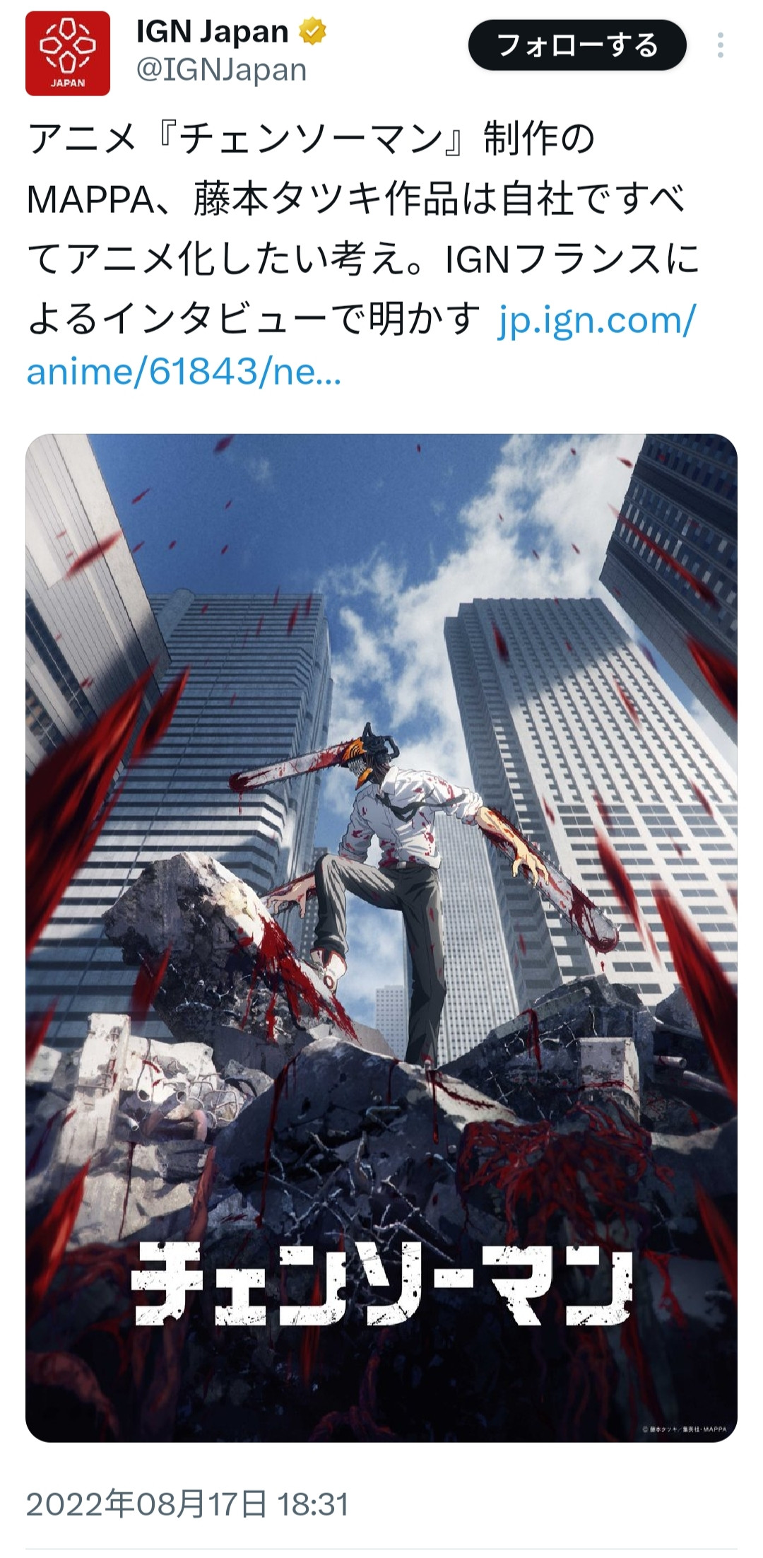 チェンソーマンってことはファイアパンチの人か。俺には合わな過ぎて記憶から消したらしい。