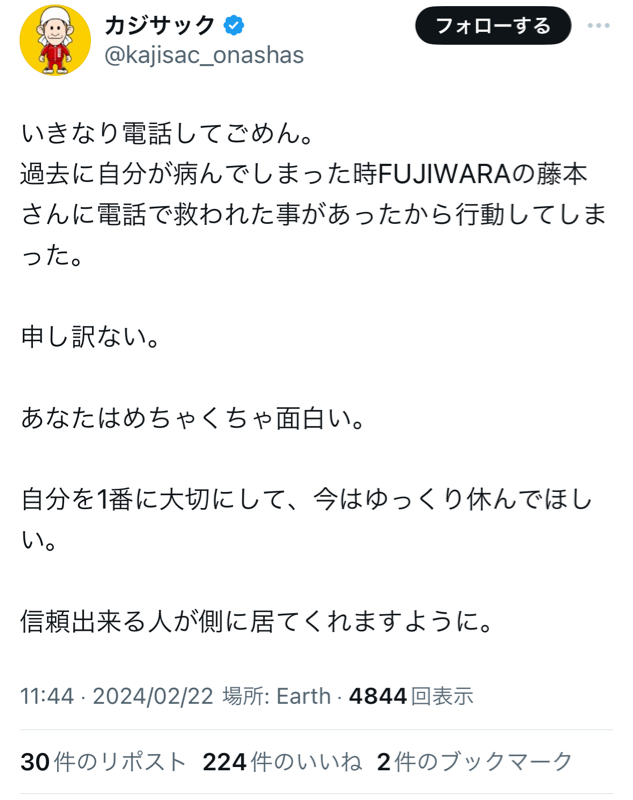今カジサックから電話あった