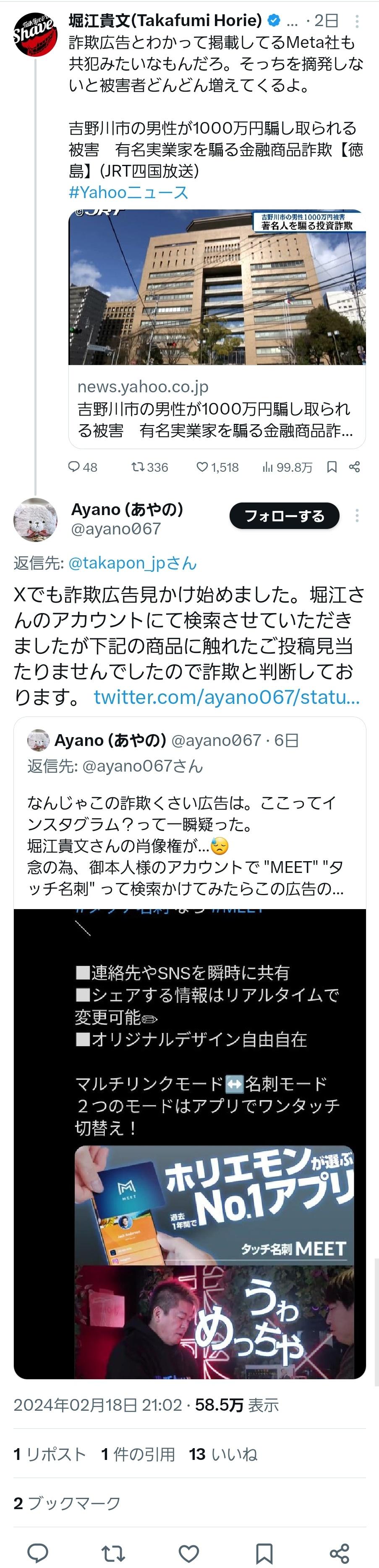 ホリエモン「おいMeta、詐欺広告削除しろよ」