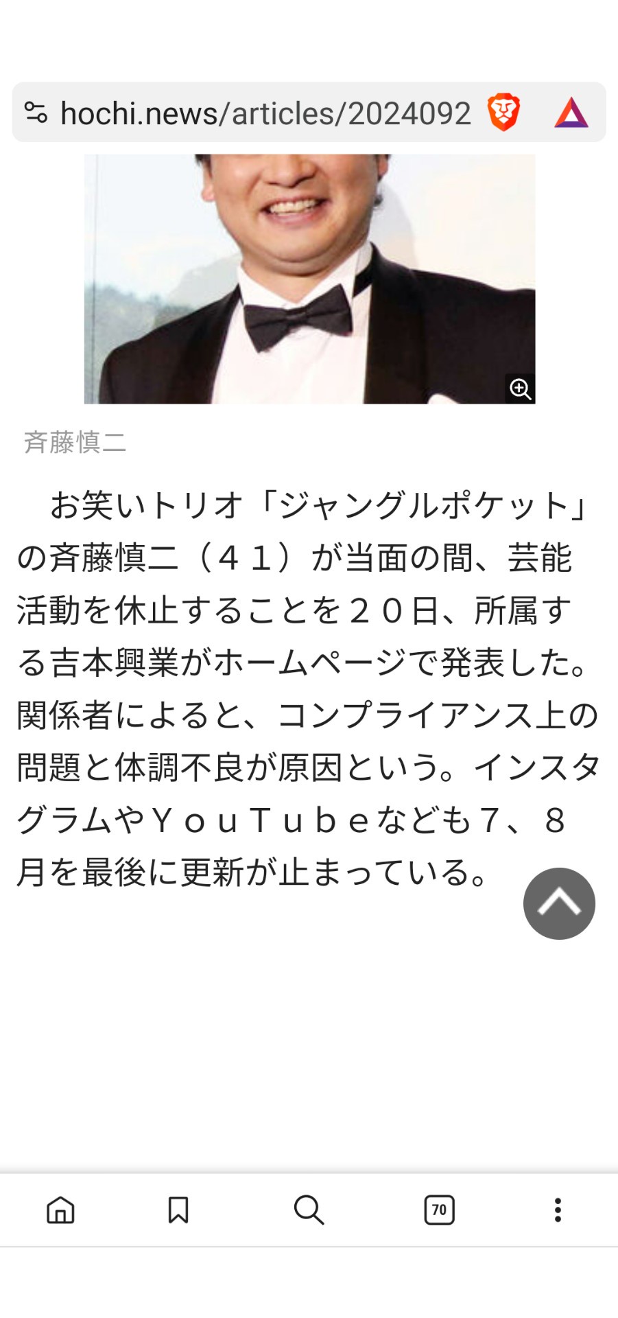 同サイトでは、「弊社所属 ジャングルポケット 斉藤慎二に関するご報告」と題し、「弊社所属 ジャングルポケット 斉藤慎二につきましては、先月来、入院するなど体調不良が続いておりましたが、このたび、本人より、当面の活動を休止したい旨の申入れがありましたのでご報告いたします」と報告。